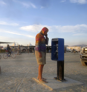 A few days in I had better luck at the Temple of the Flying Spaghetti Monster. Their tech guy had figured out a way to go online and I was able to sent out my first BMan blog and say hello to my family. When I finished I noticed a phone booth next to their camp. In my own naive way I asked if it worked. Aaron (the tech guy) proudly said, "Yep and it's free. Anywhere in the world, five minutes".